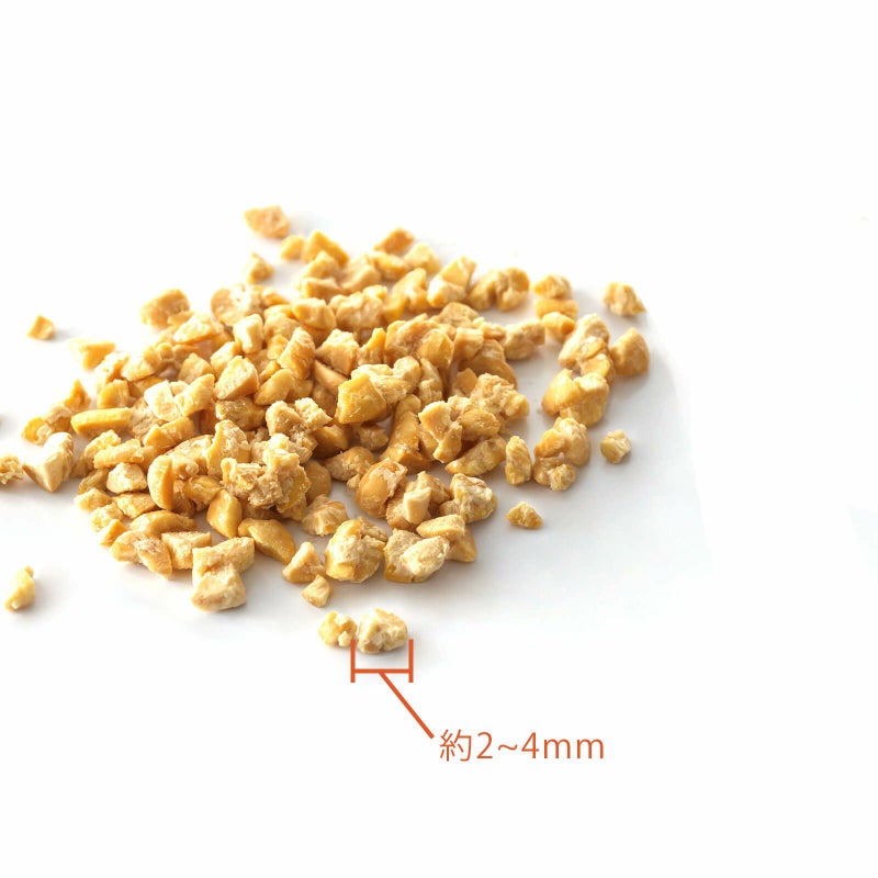 皮を取り除いた大豆を砕いて発酵させた、丸粒納豆とは違う製 法で作った“ひきわり”納豆。天然そのままフリーズドライ加工し、サクサク食感に仕上げました。いつものごはんにトッピング や手作り食の材料として、いろいろなアレンジが愉しめます。