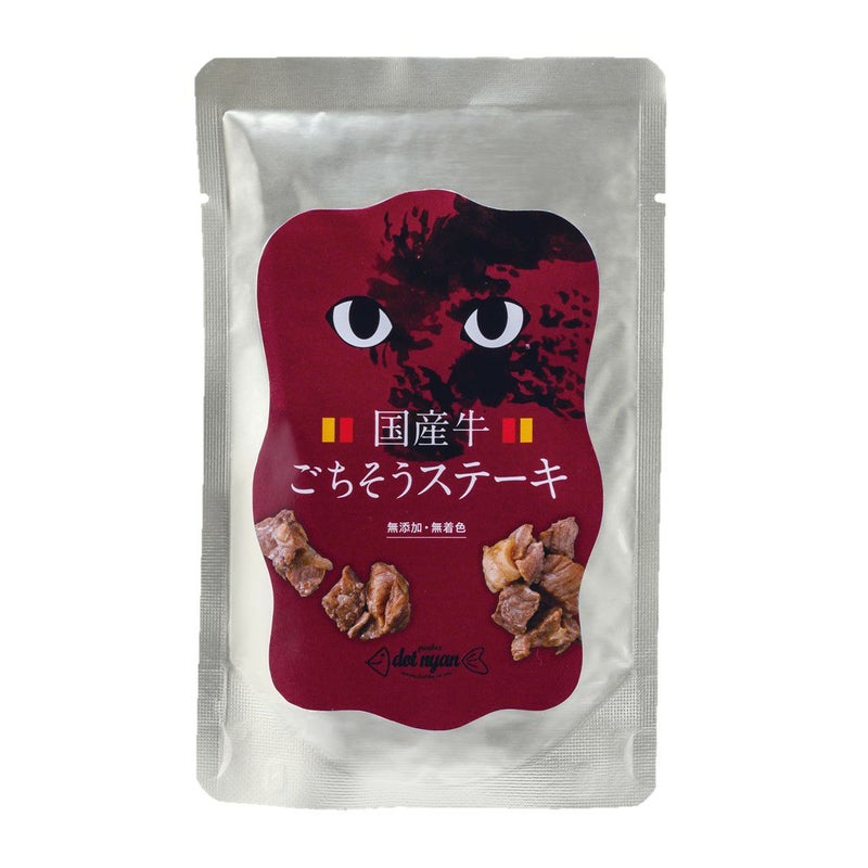 国内で大切に育てられた国産牛の赤身部位モモ・カタを使ったステーキ。旨みと甘み、栄養と香りをすべて逃さない独自製法で、余計なものは一切加えず美味しく仕上げました。水を加えないレトルト加工で、牛肉の香りや旨みをギュッと閉じ込めた国産牛ステーキ。お肉が大好きなニャンコにとっては、瞳が輝くごちそうです。